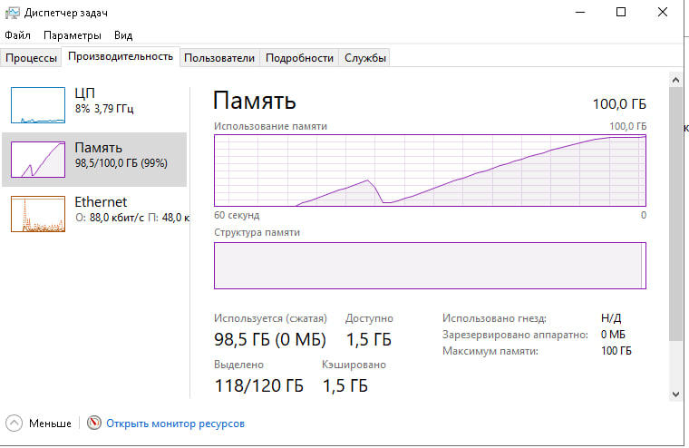 Классическая RDS-ферма, Win2019. Пользователь открывает базу и этот процесс забирает всю оперативную память на сервере.