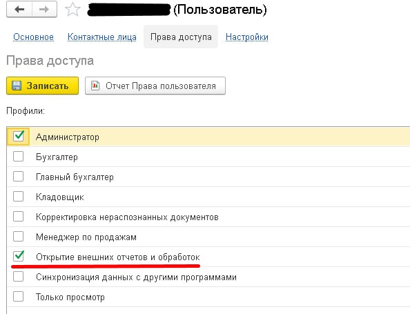 Для запуска внешней обработки у пользователя должны быть права на запуск. Эта настройка по пути 1С база -> Администрирование -> Пользователи -> Нужный пользователь -> Права доступа -> галочка пункта «Открытие внешних отчетов и обработок»